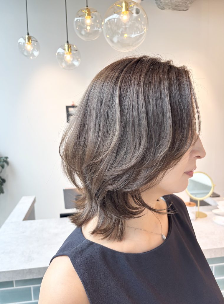 表面に動きが出るようにレイヤーを入れ、自然な外ハネで軽やかさをプラス。